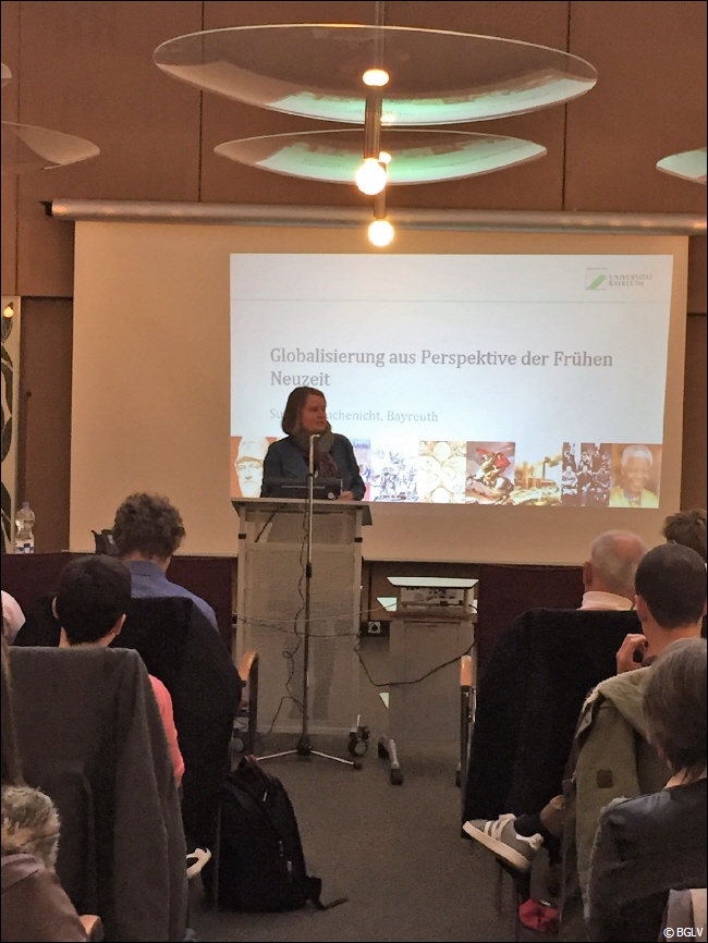 Prof. Dr. Susanne Lachenicht (Inhaberin des Lehrstuhls für Geschichte der Frühen Neuzeit an der Universität Bayreuth) hielt einen Vortrag zum Thema „Globalisierung aus Perspektive der Frühen Neuzeit“ und stellte zwei Kernelemente ihrer Forschung heraus: Anhand der beiden Fragen Gab es Globalisierung in der Frühen Neuzeit? und Was bedeutete sie zu dieser Zeit? analysiert sie das Thema von der Frühen Neuzeit her und nicht rückwärtsgerichtet aus der Gegenwart.
