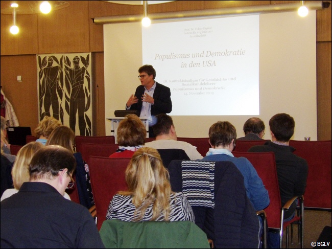 In ihren Eröffnungsansprachen führten der wissenschaftliche Leiter der Veranstaltung, Prof. Dr. Volker Depkat (Professor für Amerikanistik an der Universität Regensburg und Historiker), sowie Ltd. OStD Franz X. Huber (Ministerialbeauftragter für die Gymnasien in der Oberpfalz), in das „traurig aktuelle“ Thema der Veranstaltung „Populismus und Demokratie“ ein. StD Theo Emmer (BGLV und bpv) dankte den Veranstaltern, insbesondere Prof. Depkat und den Referenten, für ihr Engagement, sowie StDin Claudia Reichmann von der MB-Dienststelle für die große Unterstützung. Für ihn war es das letzte Kontaktstudium als Tagungsleiter, weil er Ende des Schuljahres aus dem aktiven Dienst ausscheiden wird. Der Ministerialbeauftragte und OStRin Alfrun Gebauer (Vorsitzende BGLV) dankten ihm für sein Engagement und überraschten ihn mit einem Präsent.